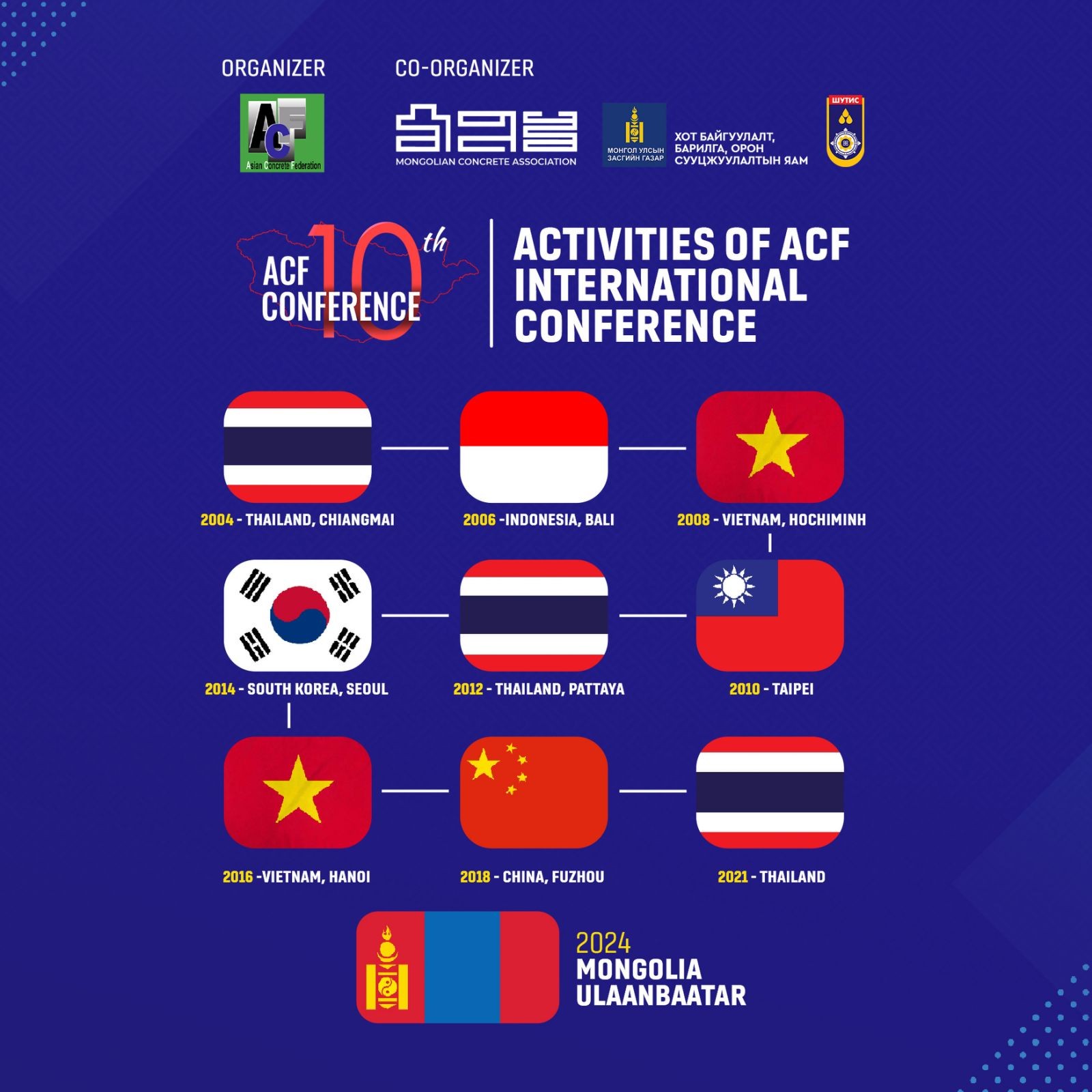 ACF холбоо нь гишүүн улс орнуудын шинжлэх ухааны хамтын ажиллагааны таатай нөхцөлийг хангах үүднээс хоёр жил тутамд Азийн орнуудад олон улсын эрдэм шинжилгээний хурлыг тогтмол зохион байгуулсаар ирсэн. Хот байгуулалт, барилга, орон сууцжуулалтын яам, Азийн Бетоны Холбоо /ACF/, ШУТИС, болон Монголын Бетоны Холбоо /MCA/ хамтран Монгол Улсын нийслэл Улаанбаатар хотноо