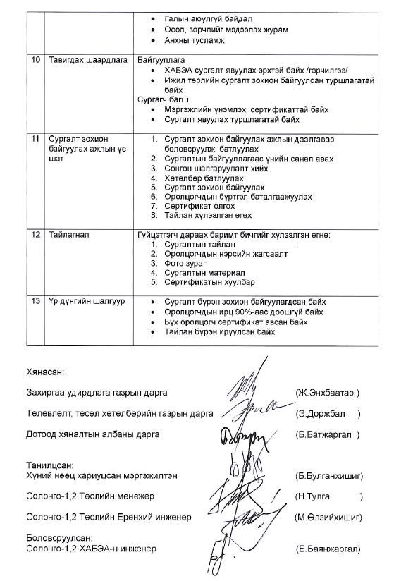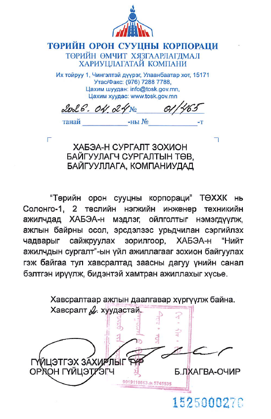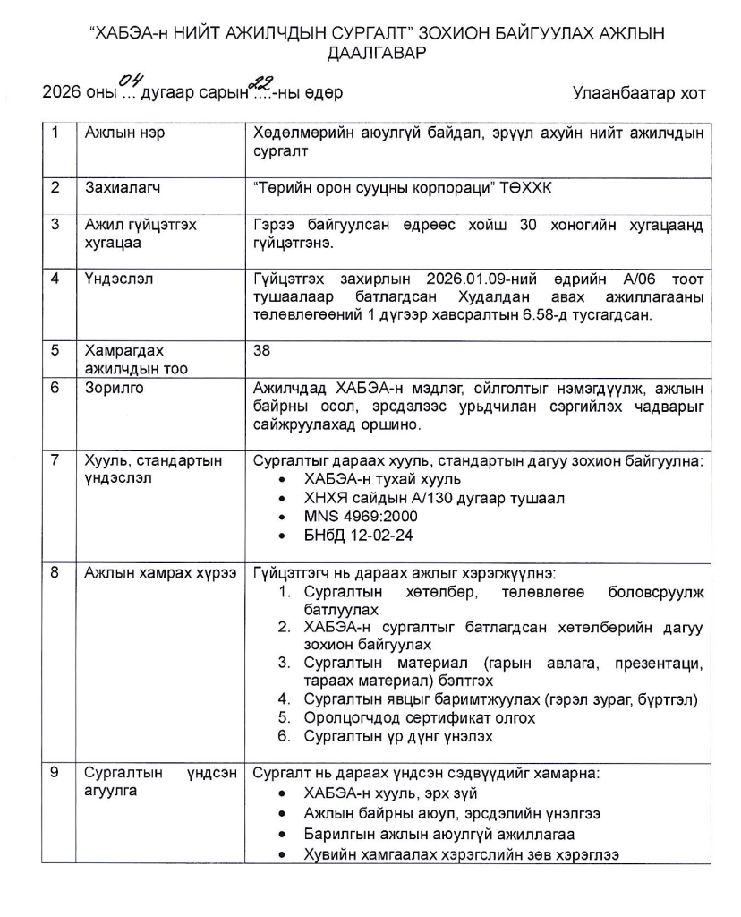 “Төрийн орон сууцны корпораци” ТӨХХК нь Солонго-1,2 төслийн нэгжийн инженер техникийн ажилчдад Хөдөлмөрийн аюулгүй байдал, эрүүл ахуйн мэдлэг, чадварыг сайжруулах зорилгоор сургалт зохион байгуулах гэж байгаа тул сонирхогч байгууллагууд дараах ажлын даалгаврын дагуу шаардлагатай материалуудыг 2026.05.05-ны өдрийн 17:30 цаг хүртэл info@tosk.gov.mn цахим хаягаар ирүүлж, хамтран ажиллахыг хүсье.